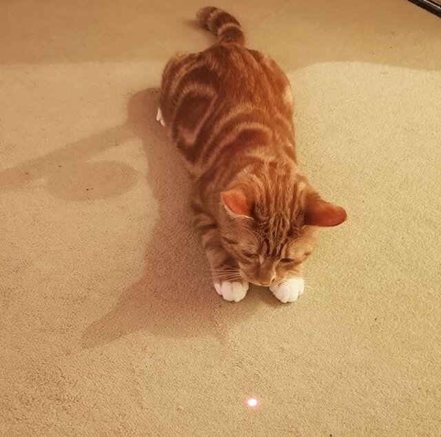 Все игры домашних кошек сводятся к одной цели – к охоте. Так они реализуют свой природный инстинкт. Когда добыча прямо перед ними, в организме происходит резкий скачок адреналина. Их зрачки расширяются, каждая мышца тела напрягается, природный нюх и слух обостряются. В полной боевой готовности они нападают на свою жертву. Когда они чувствуют добычу в своих когтях, когда могут попробовать её на зуб, гормон дофамин постепенно вытесняет адреналин. Этот гормон, в данном случае, отвечает за состояние удовлетворения от достигнутой цели. После чего мозг даёт телу сигнал, что можно расслабить мышцы и пребывать в состоянии лёгкого блаженства. Постоянное повторение данных действий помогает кошке не только всегда пребывать в хорошем настроении, но и чувствовать уверенность в себе. Теперь представьте, что происходит с кошками, когда вы играете с ними лазером. Они видят цель, но не слышат, как она передвигается, и не могут почувствовать её запах. Это создаёт разрыв шаблона в мозгу у кошек и вызыва