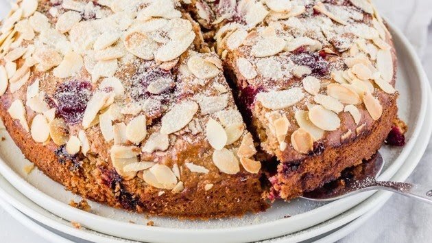 1 час. Калорийность: 🔥 925 ккал на порцию. 925 ккал на порцию. Ингредиенты: 🔥 Вишня — 400 г Пшеничная мука — 200 г Сливочное масло — 190 г Мелкий сахар или сахарная пудра — 140 г Яйца куриные — 4 шт. Нарезанный хлопьями миндаль — 50 г Сахарная пудра — 50 г Разрыхлитель — 1 ч. л. Ванильный экстракт — 1/4 ч. л. Соль морская — 1 щепотка (можно и обычную) Способ приготовления: 🔥 Духовку предварительно разогреть до 180 °С. Замороженную вишню разморозить. Муку просеять. Взбить 180 г предварительно размягченного сливочного масла с сахаром до состояния легкого крема. Продолжая взбивать, по одному ввести яйца, затем половину муки, щепотку соли, разрыхлитель и ванильный экстракт. Добавить оставшуюся муку. Форму для выпечки смазать о
