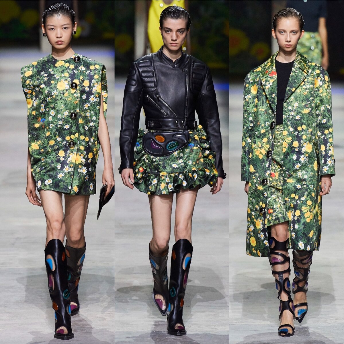 На самом деле, вдохновением для этой коллекции послужила настолько дебильная тема, что мне и говорить об этом неловко. «Эко-сексуальность»... но давайте разбираться, что под этим Кейн имел в виду. Эко темы в коллекции действительно много. Цветочный принт просто прекрасен - сочный, летний, душистый. Вы только посмотрите на все эти луговые ромашки - они чудесны. Этот цветочный принт перенесен с фотографии, сделанной Кейном и его сестрой Тэмми, когда они гуляли по местному лондонскому парку. Проекции этих луговых цветов можно было также наблюдать на стенах и подиуме. Теперь о сексе. Сам слоган «эко-сексуальность» был позаимствован из книги-руководства по сексу Мастерса и Джонсон 1970г. , но Кейн решил провести параллель между умением наслаждаться моментом и подходом к своему дизайну. Честно говоря, я д