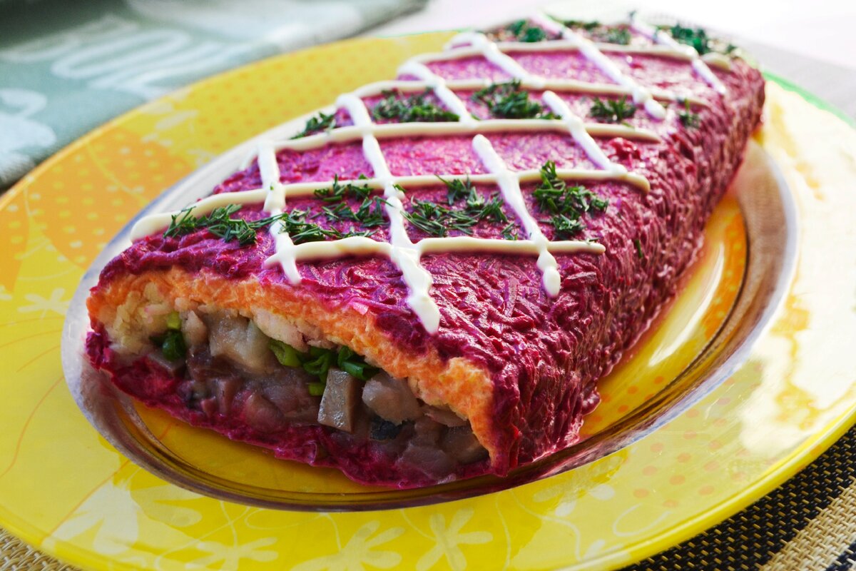 Салат " Селедка под шубой" один из самых распространенных салатов, без которого некоторые не представляют застолья. Существует множество вариантов приготовления салата, я хочу предложить вам свой рецепт в виде- рулета. Ингредиенты: Тушка селедки - 1 штука Свекла - 1 штука (200 грамм) Морковь - 1 штука (180 грамм) Картофель - 1-2 штуки ( 160 грамм) Майонез - 4-5 столовых ложек Зеленый лук - 10-20 грамм Укроп для украшения Соль Свеклу, морковь и картофель вымыть и отварить в мундире до готовности. Дать остыть. Все овощи почистить и натереть раздельно на мелкой терке. Первый слой - свеклу смешиваем с двумя столовыми ложками майонеза, перемешиваем, немного солим. Второй слой - морковь смешиваем с двумя столовыми ложками майонеза ( можно немного меньше) , выкладываем поверх свеклы. Третий слой - отварной картофель, натираем поверх моркови, смазываем майонезом Зеленый лук измельчить. Сельдь разделать на филе и нарезать небольшими кусочками. Уложить в середину нашего руле