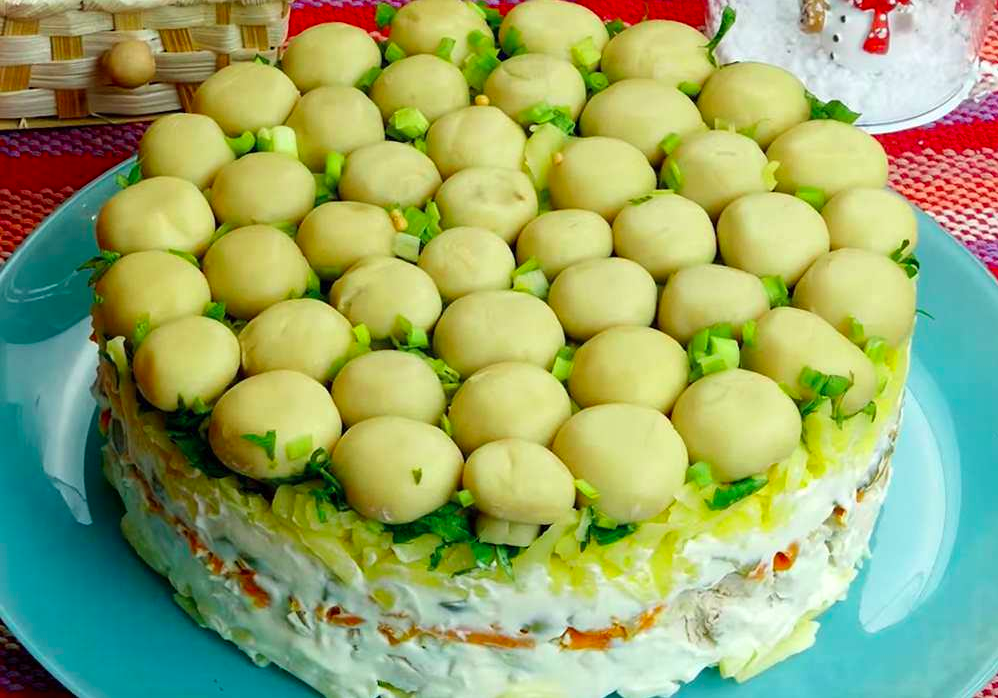 Хозяйки часто вспоминают об этом блюде накануне дней рождения и зимних праздников. И в этом нет ничего удивительного, салат грибная поляна — украшение любого праздничного стола. Свое название он получил, как раз из-за оформления, которое выглядит очень нарядно и аппетитно. Для того, чтобы приготовить угощение не требуется особых навыков, но сам процесс займет немало времени — все ингредиенты надо предварительно подготовить, после собрать блюдо и дать ему пропитаться в холодильнике. Результат вашего труда гости оценят по достоинству. Салат можно готовить в двух вариантах: Для приготовления салата грибная поляна вам понадобится: 400г мелких консервированных шампиньонов; 250г отварного куриного филе или ветчины; 200г вареной моркови; 2 средних отварных картофеля; 200г хорошего твердого сыра; 2 крупных соленых огурца; небольшой пучок укропа; черный перец, соль и майонез. Пошаговый рецепт «перевернутого» блюда. Заранее подготовьте все ингредиенты — отварите и почистите овощи, сварите и
