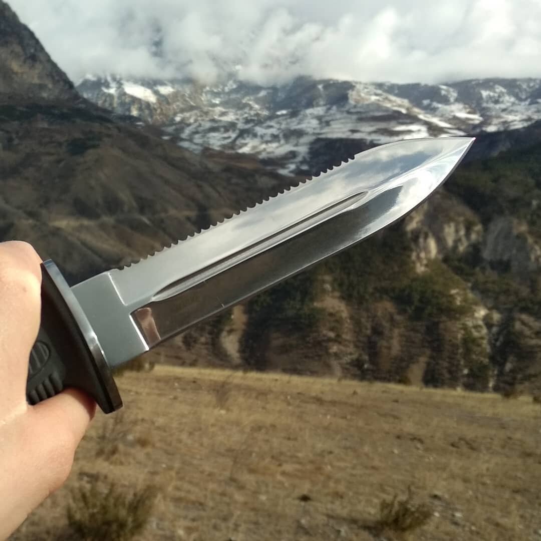 Всем здравия, друзья. Хочу представить вашему вниманию охотничий кинжал «Комбат». Начну с характеристик: Общая длина: 304 мм, Длина клинка: 170 мм, Толщина клинка: 4.8 мм, Твердость клинка: 58-59 HRC, Сталь: AUS-8, Материал рукояти: Эластрон, Спуски: вогнутые, Форма клинка: кинжальная симметричная, Конструкция: Сплошная жесткая, Ножны: Натуральная кожа со вставкой из АБС пластика Характеристики и внешний вид говорят, что нож относится к холодному оружию. Копьеобразный клинок двухлезвийный имеет длинные вогнутые спуски, вдоль лезвия с двух сторон имеются узкие долы. Незаточенная пята в три сантиметра позволяет применять различные хваты с выносом пальцев на клинок, что является плюсом, как на охоте, так и при боевом применении ножа. Развитая крестовина надежно защитит руку от соскальзывания на лезвие, а эластроновая рукоять кинжала позволит надежно фиксировать нож даже в мокрой руке. Рукоять напресованна на стальной хвостовик, который проходит по всей длине и заканчивается треугольным