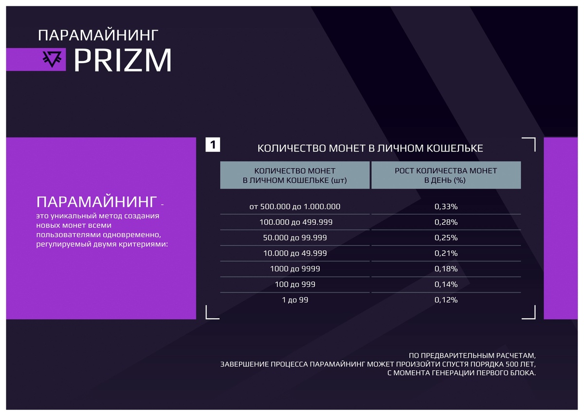 Цифровая валюта нового поколения. Полностью децентрализованная, саморегулируемая цифровая валюта с уникальной технологией - Paramining Как это работает PRIZM использует систему, в которой каждая «монета» на балансе кошелька может рассматриваться как миниатюрная майнинг ферма. Paramining это генерация новых монет. Факторы скорости генерации новых монет: Если вы хотите начать зарабатывать уже сейчас на разнице курса и технологии Paramining Вот алгоритм действий: После развития своего баланса и структуры под ним начинаем продавать парамайнинг, следя за курсом. Для продажи используем тот же обменник где покупали изначально. Придерживаясь такой схемы можно быстро развить свой баланс и наслаждаться пассивным доходом. Успех зависит от отношения к людям которые рассказали вам Pro100 PRIZM. Благодарность за посвящение в призм можно выразить если в строке пригласителей не менять адрес кошелька того, кто рассказал о призм.(пункт 20) То есть реферальные ссылки для этого и служат что бы благодар