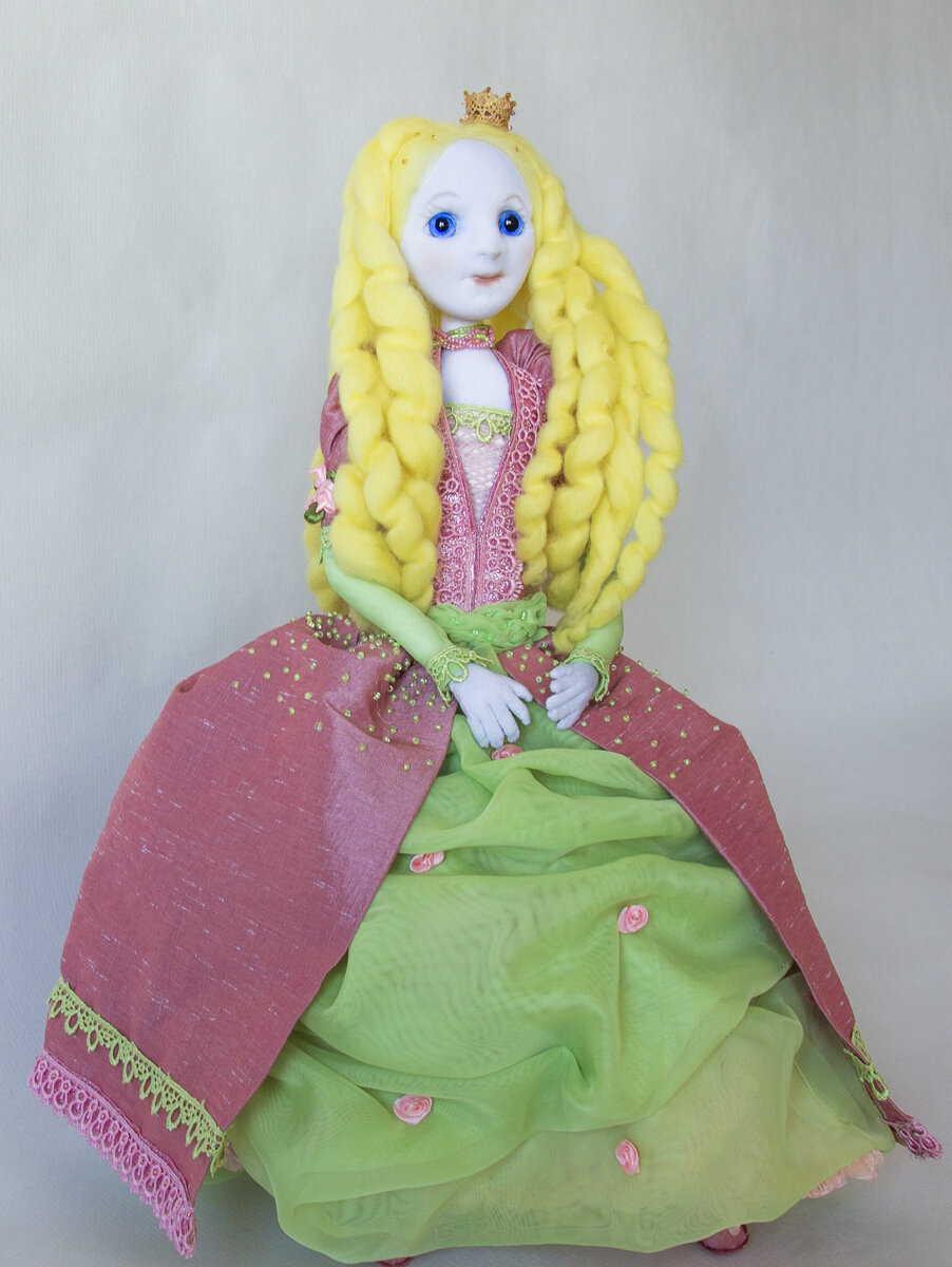 Сегодня хочу рассказать вам историю появления на свет моей Принцессы Златовласки. Это было аж года назад. Я случайно попала на бесплатный мастер класс Натальи Метелкиной по текстильным куклам и просто была очарована её куколками и обещанием, что такую красоту может создать каждый. И конечно же приобрела её курс по созданию текстильной куклы. До этого я только шила Тильд и совсем простеньких кукол. А тут нужно было создавать куклу с нуля, без выкройки. Но Наталья все настолько подробно показывала и рассказывала, что я потихоньку начала по вечерам делать свою куколку. Сильно помогали еженедельные проверки домашки, и работа медленно, но продвигалась. Именно на этом курсе я узнала про пропорции лица и тела, и чем кукольные пропорции отличаются от человеческих. Это потом мне сильно помогло в создании своих собственных выкроек кукол. Когда дело дошло до выбора образа, то в голове сразу возникла идея сделать Златовласку. Это было смутное воспоминание из очень далёкого детства, когда ба