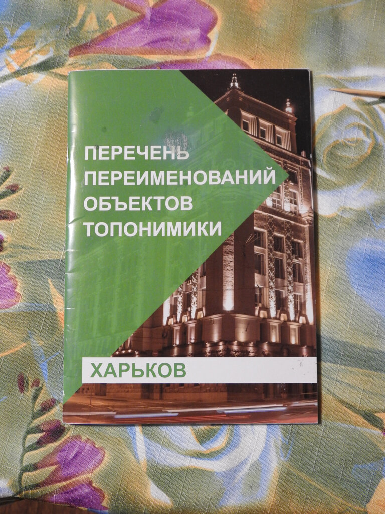 Читатели данного журнала знают, насколько мне интересны всякие топонимические особенности, новости и казусы. Так вот добрые люди преподнесли подарок — буклет, рассказывающий о достаточно внушительных изменениях названий в городе Харьков (Украина). Вероятно новая власть выпускает такие пояснительные материалы по каждому региону и распространяет среди самых широких слоев общества. Поскольку изменения касаются очень многих. Тираж 200 тысяч.