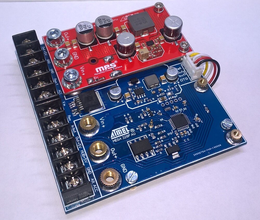 Так же есть отдельный силовой канал с коммутируемым напряжением, как на АКБ автомобиля и током нагрузки до 8А, к которому можно подключать выносной DC-DC модуль.
