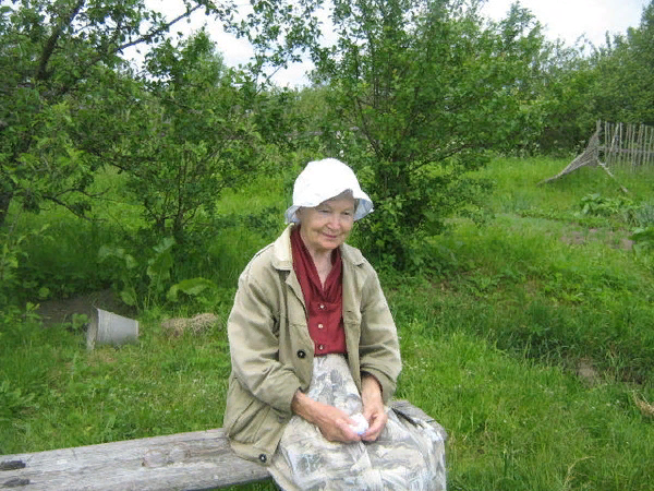 Милая спокойная женщина. Очень худенькая, голова всегда склонена, либо в платочке, либо в панамочке. Глаза всегда опущены к земле..