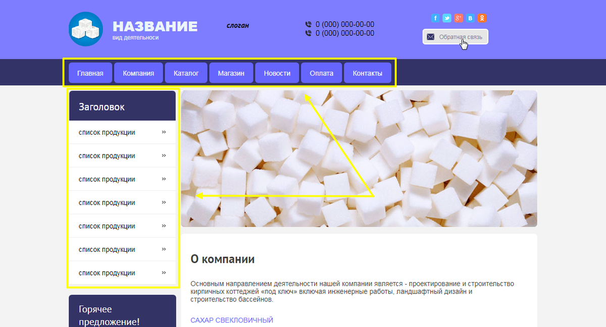 Здравствуйте уважаемые читатели, заходя на любой сайт всегда в шапке сайта находится меню или в боковой колонке список с продукцией или услугами. Выделенные элементы по структуре гипертекстовой разметки можно сказать два одинаковых блока, разница только в названии селекторов и применений стилей. Как правило такие блоки на языке html пишутся списком <ul><li>пункт меню</li></ul> Это и есть гипертекстовая разметка нашего верхнего меню. Теперь нам надо его преобразовать. Если вы без стилей написали такую разметку то браузер вам просто выведет маркированый список построеным столбиком. Первым делом пишем стили селектору .up-menu, на скрине видно что верхнее меню (её темно синий фон) идет на всю ширину экрана и наш селектор является родителем блоков которые находятся внутри него. Значит нам надо только покрасить фон свойством background:#333367 ;, в принципе от этого блока нам уже ничего не надо. Следующий наш селектор .up-option в нем уже находится сам список (будущее меню), тут нам надо опр