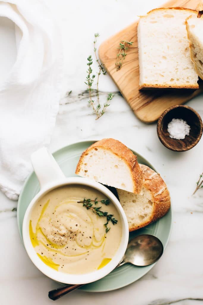 Ингредиенты: 2 крупных головки цветной капусты, с вырезанной сердцевиной и нарезанные на мелкие соцветия 1 головка чеснока, почищенная и поделённая на зубчики (если очень любите чеснок берите 2 головки) 2 столовых ложки оливкового масла, плюс ещё ложка для украшения 1 средняя луковица, нарезанная кубиками Свежий тимьян - пара веточек 4 стакана овощного бульона или фильтрованной воды 2 стакана несладкого растительного молока 2 столовых ложки пищевых дрожжей (исключите - если у вас их нет. Это не те дрожжи, которые используются для выпечки, а те, которые "веганский пармезан" - продаются на iherb) 1 столовая ложка яблочного уксуса 1 1/2-2 1/2 чайной ложки морской соли или по вкусу Свежемолотый чёрный перец, по вкусу Порядок приготовления: Разогрейте духовку до 200 градусов и застелите противень пергаментом. Разложите соцветья цветной капусты и зубчики чеснока на противне.