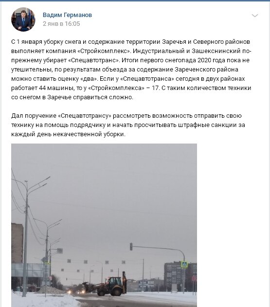 Не успели дополнительные коммунальные подрядчики продемонстрировать свое мастерство при уборке улиц от обильной заснеженности, как получили «неуд» от мэра Череповца Вадима Германова. Представители «Стройкомплекса», отвечающего за уборку Заягорбского, Северного районов и Новых углов во время снегопада выпустили на улицы города всего 17 единиц техники, в то время, как «Спецавтотранс» разъезжал по Зашекснинскому и Индустриальному районам города на Шексне на 44 единицах техники.