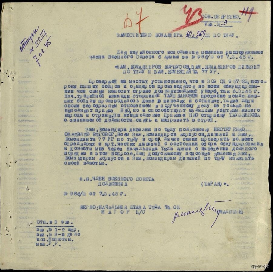 Вот такой документ недавно нашел в архиве - неприятный осадок. "Проверкой на месте установлено, что в 309 стрелковой дивизии 957 стрелковом полку похороны наших бойцов и офицеров производятся во всем обмундировании, чем наносится стране дополнительный ущерб, так 5.03.1945 начальником трофейной команды старшиной Таушкановым предание земле павших бойцов производилось в шинелях и ботинках. Такие люди своим безобразным отношением к порученному делу не только не выполняет приказ НКО но и способствует излишним убыткам для нашего народа и стране ..." Источник :Директивы и указания. № документа: 986/ш, Дата создания документа: 07.03.1945 г. Архив: ЦАМО, Фонд: 967, Опись: 0000001, Дело: 0095, Лист начала документа в деле: 43 Авторы документа: 6 А, полковник Таран А как обстояли дела с захоронением немецких солдат ? На основании директивы ЗапФ 15.12.41 г. при погребении убитых солдат противника снимать верхнюю одежду .. "При погребении убитых немецких солдат и офицеров также полагалось