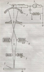 Как видно из рисунка ниже, пушка имеет катод (2), который размещен внутри прикатодного электрода (3). На определенном расстоянии от катода располагается ускоряющий электрод с отверстием — анод (4). Пушка питается электрической энергией от высоковольтного источника постоянного тока (5).