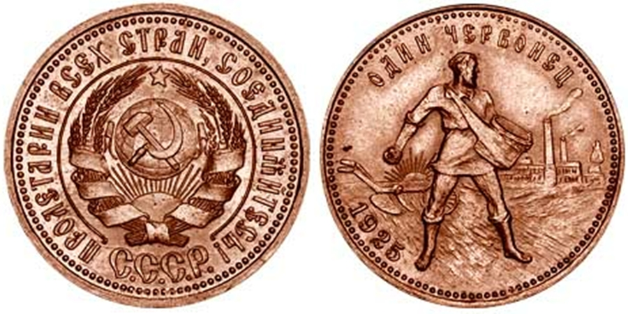 Стоимость: $76000. Червонец идентичен золотому (см. пункт 7), но изготовлен из меди. Таких червонцев было отчеканено всего несколько штук. В настоящее время известно всего несколько червонцев 1925 года: два экземпляра находятся в собраниях Пушкинского музея, три — в музее Гознака.