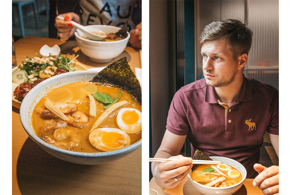 Вообще начиная с прошлого года в Петербург пришла мода на рамены и они стали открываться практически на каждом шагу, я тоже пробовал их практически везде, но самым запоминающимся для меня оказался креветочный в раменной J.Ramen. Насыщенный яркий вкус бульона идеально вписывается в моё представление концепции этого блюда. Помимо базового отвара в него явно добавили какую-то интересную пасту, от чего вся гастрономическая мелодия заиграла в разы увлекательнее. Мясистые креветки, как красочные декорации, лишь дополняют происходящее представление. Лапша хороша. Немного мини-кукурузы, гороха, овощей и идеальных половинок одного яйца идут в качестве точечных нот для хорошего рамена. Топовый, пожалуй, лучший из представленных здесь. Согреет зимой, осенью и холодным летом. Остаётся лишь придать лицу задумчивый вид и посмотреть в окно. Полный рекламный-обзор тут.
