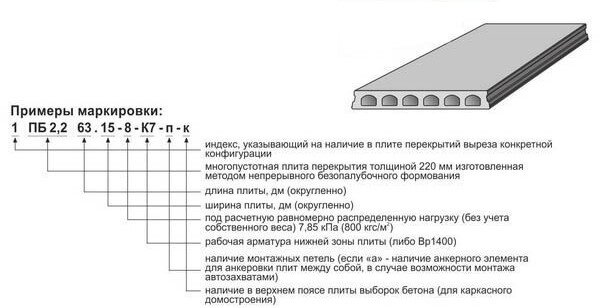 Первый тип. Пустотные плиты имеют каналы круглого сечения параллельно длинной стороне. Есть каналы и овального сечения в облегченных вариантах плит перекрытия. Кроме того, для пустотных плит характерны пазы по боковым частям длинной стороны. Производство их регламентируется ГОСТом, а маркировка содержит информацию об основных характеристиках плиты. Используют их для строительства и жилых, и нежилых помещений. Разделяются пустотные плиты на 3 большие группы. Первая группа пустотелых плит по безопалубочной технологии ПБ (ППС- плита перекрытия многопустотная). Высота 220 мм. Изготавливаются из тяжёлого бетона на производственной линии с предварительным напряжением арматуры. Могут иметь монтажные петли. Имеют точные линейные размеры за счёт изготовления на линии, где плиты нарезают алмазным диском. Их подвидом являются плиты безопалубочные облегченные модификаций ПБО, ПНО. Он