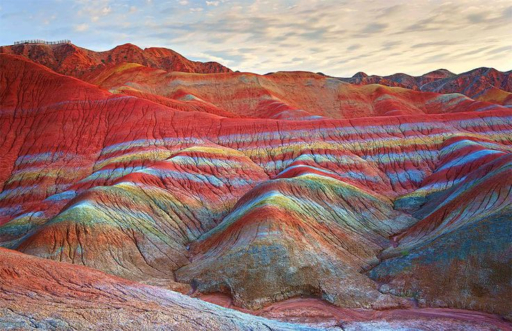 Ландшафт Дэнксия Яркие краски радуют глаз — красноватый песчаник местных гор играет на солнце множеством оттенков. Цветные горы Китая испещрены рисунками причудливой формы, напоминающими морские волны. Сегодня туристы со всего мира съезжаются в китайскую провинцию Ганьсу, чтобы полюбоваться здешним необычным пейзажем. Главной местной достопримечательностью является уникальное геологическое образование, получившее название «ландшафт Дэнксия» (англ. Danxia Landform), что означает «розовое облако». Порой случается, что то, что когда-то было великим и прекрасным, со временем забывается. Подобная участь постигла китайский город Чжанье. Тысячи лет назад это был процветающий город, один из самых богатых в стране. Здесь проходил Великий шелковый путь, и сотни торговцев приезжали сюда ежедневно с целью что-то купить или продать. Но уже тогда Чжанье интересовал многих не как огромный рынок, на котором можно было купить все, а как место с неземными разноцветными пейзажами. Через некоторое в