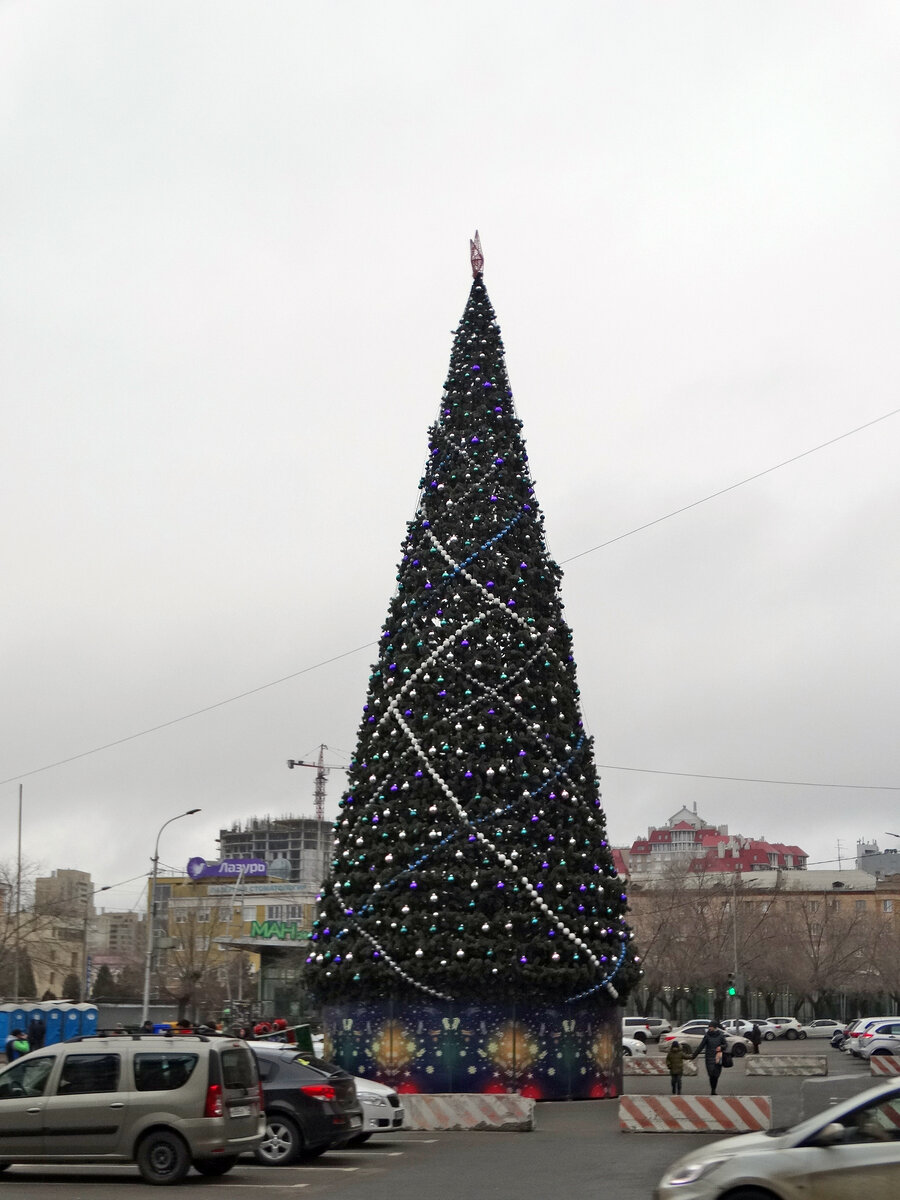 В этом году погода нас пока не балует. В том смысле, что уже 5 января, а снега как не было, так и нет. Всё растаяло ещё в начале декабря. Синоптики, конечно, обещают нам снег. Причём уже с завтрашнего дня. Правда при плюсовой температуре. Так что грязь будет точно, а вот снег опять под большим вопросом. В общем, какая-то не новогодняя погода. Солнца почти не видно, снега нет. Серое небо, серая земля, серые деревья. Кому как, а мне такая погода не нравится. Особенно не нравится отсутствие солнца. Без него как-то совсем депрессивно. Сегодня, чтобы немного развеяться, решил прогуляться в пойму Царицы. Всё хотел посмотреть на новую главную ёлку города, но пока вот не получалось. Ёлку эту, кстати, установили незадолго до нового года. Заодно решил немного пройтись по центру города. Старая главная ёлка города. Она по-прежнему стоит на площади Павших борцов. Но уже не в центре площади, а на краю, возле главпочтамта. Возле неё немноголюдно. Машин гораздо больше, чем людей. Прошёл на аллею Гер
