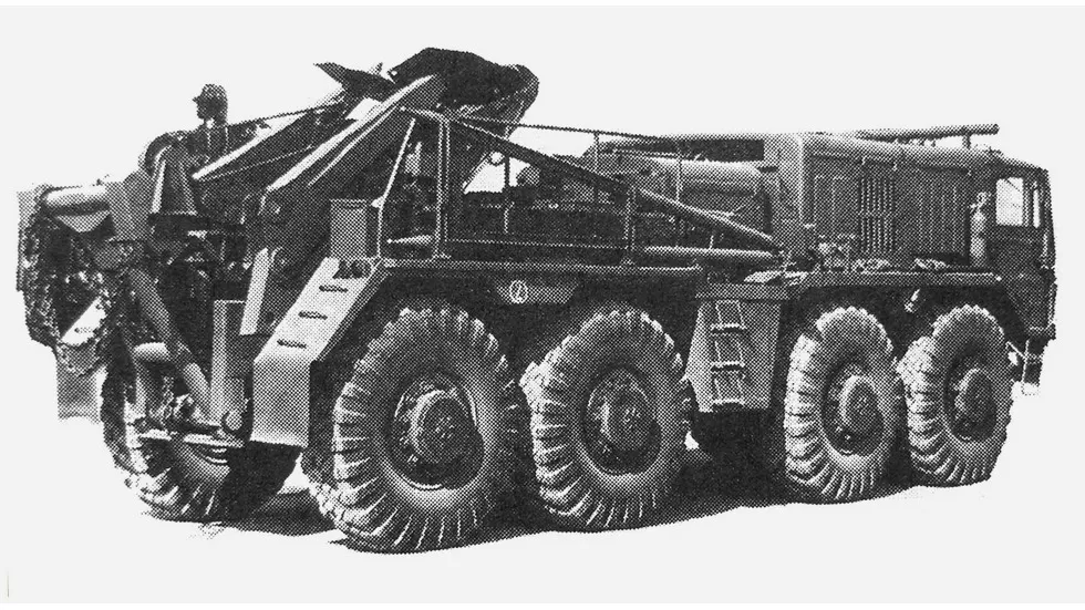 Простая профессия — ремонт и эвакуация Ограниченную гамму нехарактерных для 537-й серии машин составили доработанные шасси седельных тягачей МАЗ-537Г с лебедками, на базе которых были созданы эвакуационные тягачи и машины технической помощи, принятые на вооружение Советской армии в конце 1980-х. Первый опытный вариант тяжелого колесного эвакуационного тягача под обозначением ТК-7 был разработан в 21 НИИИ в 1984–1986 годах и собран на опытном заводе № 38. Мелкосерийный выпуск доработанной машины с военным индексом КЭТ-Т с 1987-го осуществлял воронежский Центральный авторемонтный завод № 172 (172 ЦАРЗ). Тягач снабжался специальным ремонтным и буксировочным оборудованием для оказания технической помощи в пути тяжелым многоосным автотранспортным средствам и их эвакуации на ремонтные базы на жестком буксире или в полупогруженном положении с использованием 15-тонной лебедки и подъемного приспособления с упорным сошником. Мощный передний бампер позволял осуществлять функции толкача при пе