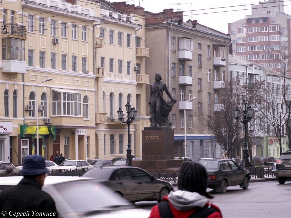 Первым литературным памятником в Ростове-на-Дону, вернее первый памятник на литературную тему в Ростове был посвящен Александру Сергеевичу Пушкину. И установлен на пересечении улицы Пушкинской и проспекта Ворошиловского. Когда улица Пушкинская, точно, как бульвар пересекает один из центральных проспектов города Ворошиловский, на самом видном месте поставили памятник Пушкину. А перед этим, на этой же улице, за квартал от памятника Пушкину стоят малые скульптурные композиции из сказок нашего великого русского поэта. Белочка с орешками. Царь- лебедь. Памятник установили в 1959 году. Практически в прошлом столетии. Автором этого культурного наследия регионального значения является Шульц Г.А. А архитектором – Минкус М.А. Бронзовый поэт стоит на гранитном постаменте и наблюдает как живут сегодня его потомки, россияне. Ведь наш город Пушкин посещал в 1820 году, когда направлялся на Кавказ. Другой дороги, минуя Ростов не было. Маленькую площадь вокруг памятника оборудовали красивыми фонарями