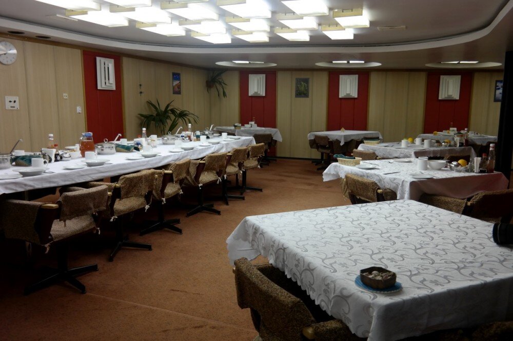 Это столовая на ледоколе "50 лет октября". Довольно просторная и аскетичная Нас уже ждал капитан Олег Михайлович Щапин, который и пригласил отведать местную кухню. То что ест и экипаж. Кислые щи с мясом. На второе котлета с рисом и немного овощей. Кстати на полгода работы атомный ледокол берет на борт 50 тонн продуктов Каюта капитана Интересная все-таки работа у людей