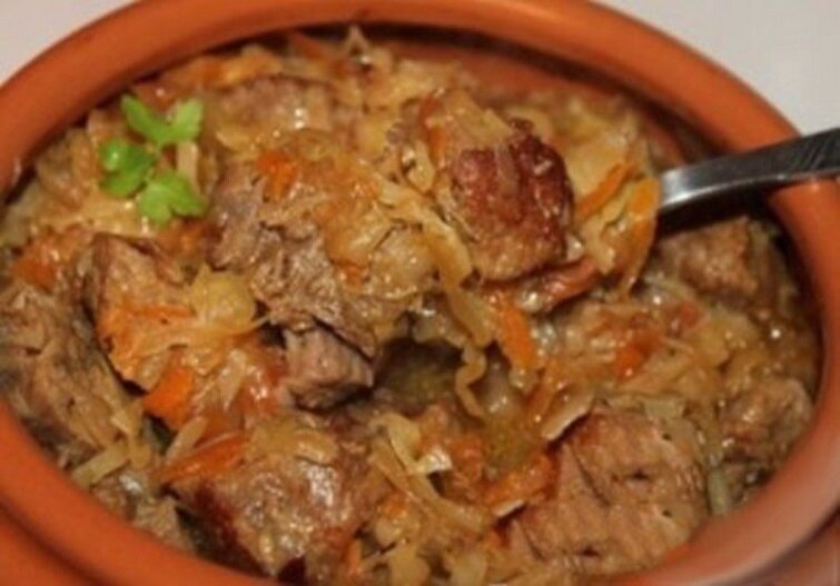 Ингредиенты: 600 гр говядины 300 гр свежей капусты 200 гр квашеной капусты 1 помидор 1 морковь 1 луковица Соль, молотый черный перец, паприка, душистый перец, лавровый лист Приготовление: Говядину вымыть и нарезать средними кусочками. Зарумянить на масле со всех сторон, посыпав паприкой и перцем. На дно горшка выложить слой кислой капусты. Добавить лаврушку, душистый перец. Сверху выложить обжаренную говядину. Влить воду, чтобы слегка покрывала мясо. Посолить. Горшок накрыть и поместить в максимально нагретую духовку. Луковицу обжарить на жире, оставшемся от жарки мяса. Добавить морковь и пассировать. Капусту нашинковать и выложить к овощам. Жарить минут 10, помешивая. Посолить. Горшок вынуть через 30 минут. Заложить тушеную капусту, закрыть и поместить в духовку на 20 минут. Затем вынуть, накрыть ломтиками помидора и поместить в духовку еще на 10 минут. Гуляш перемешать. Подавать с картофельным пюре или другим картофелем в любом виде, посыпав зеленью. Приятного аппетита!