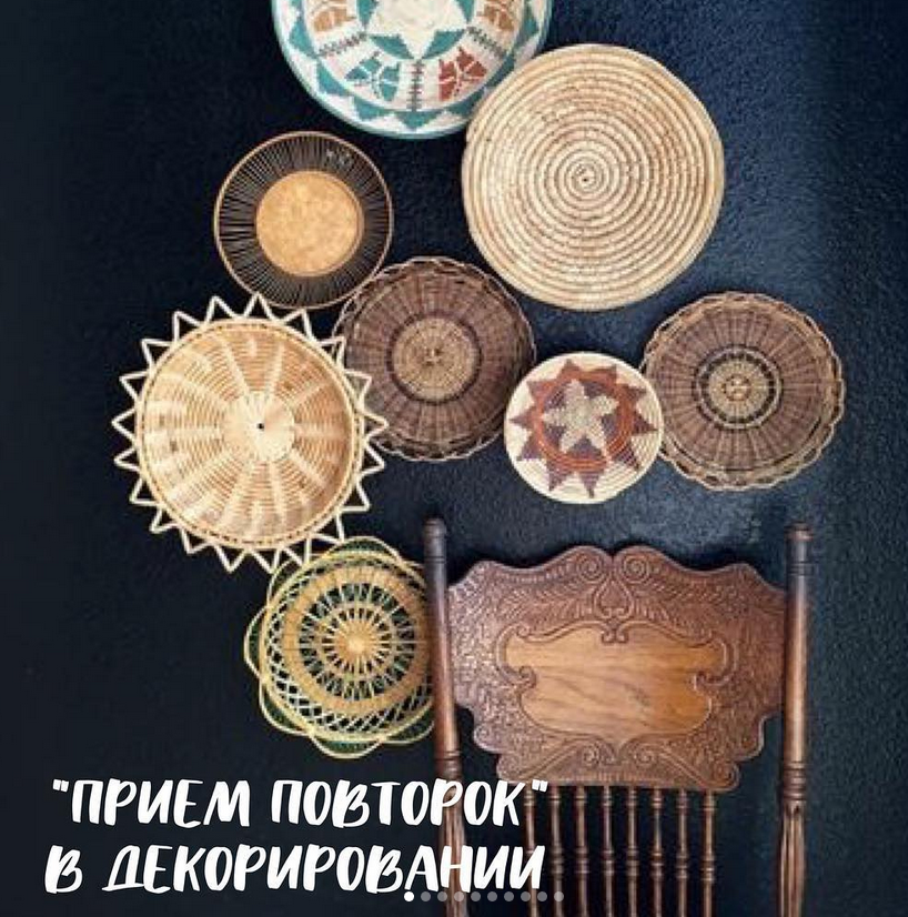 Такие детали могут быть зеркалами, тарелками, рамками с фото или гербариями, плетеными корзинками, панно, часами, шляпами и тд. Выбираете что-то одно, что вам по душе и ищите этот предмет в разных формах и размере. Можно и разного цвета, но чтобы это было как-то оправданно, либо наоборот, взять за основу один какой-то цвет и найти много зеркал в золотых, например, рамах, но разного размера и формы.