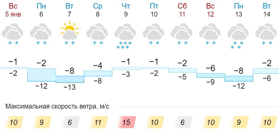 На неделе в Кировской области ожидается снег и относительно теплая погода. По прогнозу синоптиков, жителей региона ждет небольшое похолодание в начале недели до -8°С, после которого температура воздуха опять поднимется до значений -1…-4°С. Так, в понедельник в регионе температура днем составит -2°С, при этом ночью опустится уже до -12°С. Синоптики обещают пасмурную погоду и осадки в виде снега. Во вторник ожидается похолодание до -8°С днем и -13°С ночью. При этом будет переменчивая облачность и также вероятен снег. Уже в среду, 8 января, температура начнет подниматься и днем столбики термометров остановятся на -4°С. В четверг, пятницу и субботу синоптики обещают дневную температуру в районе -1…-2°С, снег, особенно сильный в четверг, и усиление ветра с порывами до 15 м/с.