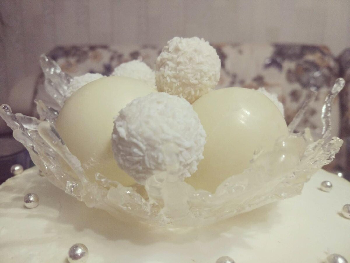 С вами канал Вкусно Дома! У нашей любимой мамочки, бабушки Юбилей! Оформляем праздничный торт красиво: съедобной вазой с застывшими брызгами, шоколадными шарами, конфетами Раффаэлло. Получается очень красиво, нежно! Готовится декор быстро и легко. Ингредиенты: Для шаров: Для вазы: Раффаэллки были готовые. Приготовление 1. Шоколадные шары Шоколад ломаем на кусочки, кладём в кастрюльку. Растапливаем на медленном огне, помешивая. Столовой ложкой выкладываем шоколад в силиконовую форму с полусферами, распределяем снизу к верху. Получится 6 шт. Если остались просветы, повторяем слой (после того как немного схватится). Убираем в морозильную камеру на 10-15 минут. Аккуратно снизу выдавливаем форму, достаём шоколадную полусферу. Чтобы склеить полусферы шара в круглый шар: кладём половинку на горячую поверхность, разогретую в микроволновке тарелку или крышку перевёрнутую над кастрюлей. Двигаем половинку пару раз из стороны в сторону чтобы низ подплавился и выровнялся. Убираем полусферу (д
