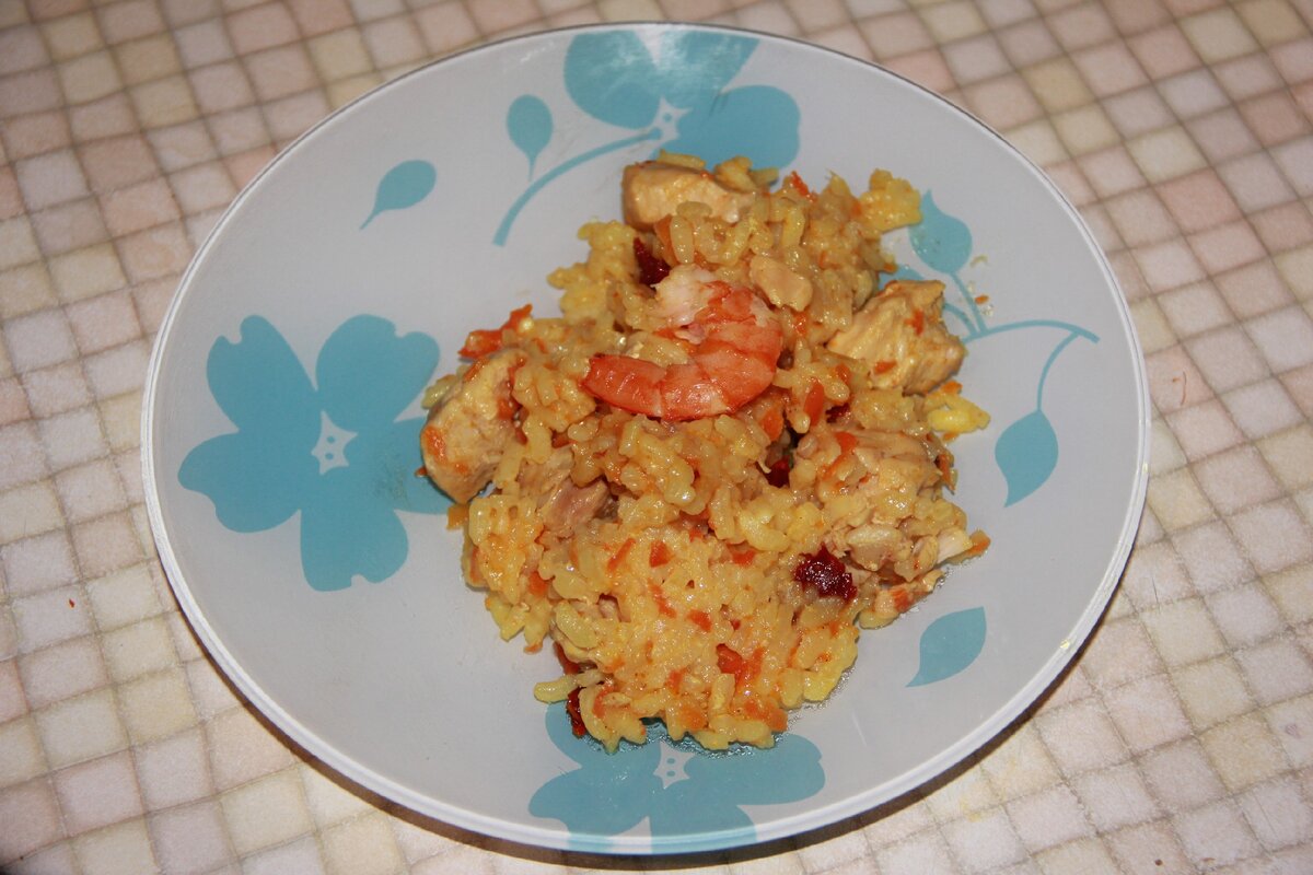 Ингредиенты: 1. Филе куриной грудки -400 гр 2. Креветки королевские - 300-400 гр. 3. Рис арборио - 400 гр 4. Вяленые помидоры 5. Морковь- 2 шт. 6. Лук репчатый - 2 шт. 7. Чеснок - 1-2 зубчика 8. Куркума 9. Перец свежий - 1 шт. Чеснок и репчатый лук мелко порезать и закинуть на предварительно разогретую сковороду. Слегка обжарить. К обжаренному луку и чесноку добавить морковь, натертую на крупной терке. Обжарить, чтобы морковка впитала в себя весь аромат, и добавить воды, оставив тушиться на среднем огне. Когда вода практически выкипит, добавить в сковороду свежий перец и продолжать тушить вместе в морковкой. У меня свежего перца не было, поэтому я использовала замороженный. Следующим шагом к нашим овощам добавляем нарезанную на кусочки куриную грудку. Хорошо перемешиваем и даем немного протушиться и напитаться ароматами. Мясо и овощи посолить по вкусу. В практически готовую курочку добавляем мелко нарезанные вяленые помидоры. Добавлять их, ориентируясь на личные предпочтения, но не мен