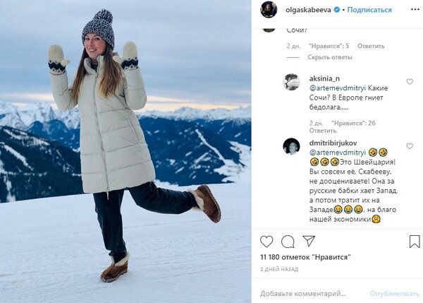 Ведущая политического ток-шоу Ольга Скабеева, пожалуй, самая скандальная медийная фигура на российском ТВ. Она известна своей жесткой «патриотической» позицией, активно критикует Украину, «загнивающую Европу» и США. Однако, скандалы не связаны с ее журналистской деятельностью, расследованиями и репортажами. Тут у Скабеевой по нулям. Известна она прежде всего тем, что, вливая в уши россиянам как на Западе плохо и как там не любят Россию, она все же предпочитает вместе с семьей отдыхать именно там. Вполне возможно, что она делает это через силу или из-за профессионального интереса – ведь как критиковать Европу, не побывав там? Ведь это все равно что «не читал, но осуждаю». Но пользователи соцсетей не оценили «подвига» ведущей, особенно раскритиковали ее земляки - Скабеева родом из города Волжск – города-спутника Волгограда. Под фотографиями в Инстаграме ведущей, где она позирует на фоне Альп, пользователи оставили сотни комментариев, впрочем, ни на один ведущая так и не ответила – вероят