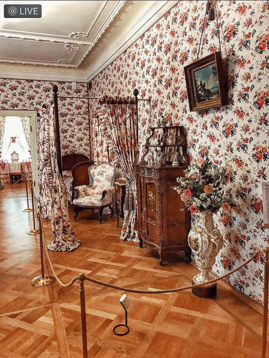Это самая «живая» спальня из всех что я видела. В том смысле, что я показывала уже парадные опочивальни в которых никто не спал, и сделаны они были исключительно для выставления напоказ. ⠀ Здесь же спала и приводила себя в порядок великая княгиня Елена Павловна (до принятия православия принцесса Фредерика Шарлотта Мария Вюртембергская), была супругой великого князя Михаила Павловича (Великий князь Михаи́л Па́влович (1798, Санкт-Петербург — 1849, Варшава) — четвёртый сын Павла I и Марии Фёдоровны, самый младший ребёнок, единственный порфирородный из сыновей Павла I (то есть родившийся в период его правления)). ⠀ С Середины 18 века восточная часть Большого дворца была отведена под женскую половину, здесь располагались личные покои владелиц резиденции. В 1860-х годах по личному пожеланию Елены Павловны юго-восточную часть дворца перестроили. С тех пор здесь Опочивальня и Уборная. На мой взгляд, очень уютные интерьеры. ⠀ Стены обиты ситцем с цветочным узором. Комната зонирована ширмами