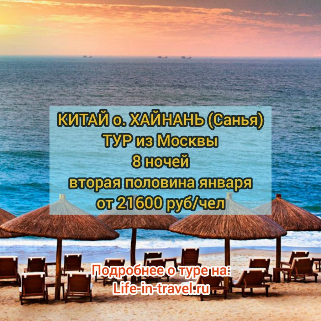 Тур в Китай на остров Хайнань (Санья) из Москвы, с проживанием в отеле, перелетом и трансфером, на 8 ночей, всего от 21606 рублей на человека, за весь период проживания. Вылеты на остров Хайнань во второй половине января (2 даты). Виза, для посещения острова Хайнань, не требуется - всё необходимое оформит туроператор. Посмотреть этот тур или другие, сравнив цены: