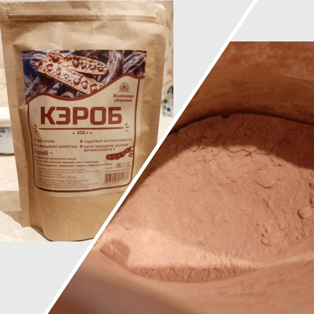 Как-то я зашла в магазин здорового питания, чтобы купить цельнозерновой муки для выпечки хлеба, и обратила внимание на упаковку со странный названием – Кэроб. Продавец пояснила мне, что это натуральный заменитель какао. Я взяла на пробу. Цена – 110 руб. за 200 грамм. Принесла домой, поставила на полочку и … успешно о нем забыла. А вот сейчас, после 2-х операций, мне абсолютно запрещено какао, вот тут-то я и вспомнила о своей покупке. Открыла пачку и увидела: кэроб по виду мало отличается от какао-порошка. Единственное отличие в оттенке коричневого цвета. Запах также похож на какао, только менее интенсивный.