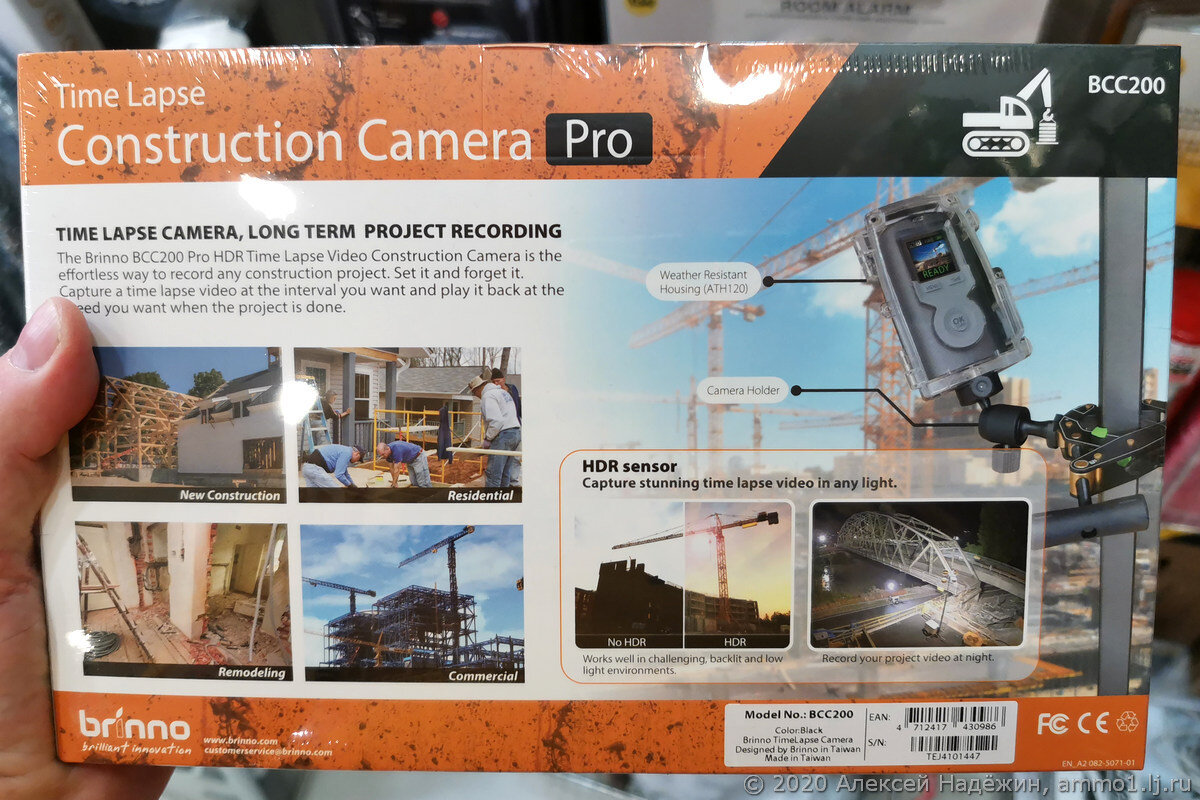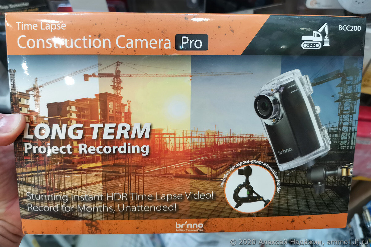 Камера, которую я встретил в магазине, называется Brinno BCC200. Стоит она довольно дорого - около $300. У этого же производителя есть модель попроще BCC100 (около $200). Конечно, таймлапс-камеру для строительства можно соорудить из камеры видеонаблюдения или из экшн-камеры, но тут вся прелесть в том, что это совершенно простая и автономная штука ("повесил на столб и забыл"). Жалко, что ничего по