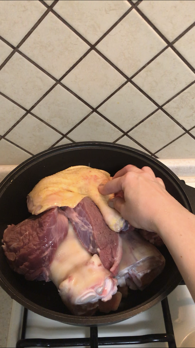 ⠀ Да, новогодняя ночь позади, но хочу оставить рецепт здесь, ведь холодец любят многие не только раз в году 😊 Но многие и не любят его в основном из-за процесса приготовления. А вы любите холодец ❓ И какой? Сегодня предлагаю вам приготовить курино-говяжий 🤗 ⠀ Ингредиенты: 🍲Говяжьи ножки 🍲Говяжье мясо 🍲Куриное мясо 🍲Лук 🍲Морковь 🍲Перец горошек 🍲Соль 🍲Чеснок 🍲Лавровый лист(по желанию) ⠀ Приготовление: Сложить хорошо вымытое мясо в кастрюлю, по мере закипания снимать пенку. После закипания слить воду и налить чистую. После закипания положить лук, морковь, посолить ( учитывая, что жидкости станет меньше). Варить на медленном огне 5-6 часов. Измельчить мясо, сложить в формочки, залить процеженным бульоном и добавить измельчённый чеснок. Остудить и отправить застывать в холодильник. Приятного аппетита! #холодец рецепт #холодец #рецепты #чтоприготовить#вкусная еда
