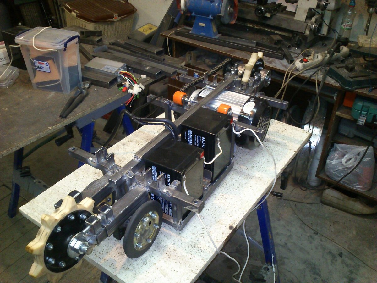 О возможности кататься на сноуборде не только по склону, но и по горизонтальной поверхности, задумываются многие, но не многие доводят эту мысль до практической реализации. Один из тех, кому это удалось, - Алексей Слесарь из Жуковского. Первым вариантом был гусеничный прототип, который питался от двух свинцовых аккумуляторов, соединённых последовательно (24 В, 12 Ач). Ёмкости хватало всего на 20 минут езды - это не удивительно, ведь для того, чтобы гнуть гусеницу, особенно зимой, когда резина становится жёстче, нужно тратить значительное количество энергии. В целях снижения потерь и увеличения дальности и времени поездки на одном заряде, гусеницу было решено заменить на колесо. При этом рассматривалось два варианта: мотор-колесо с широкой покрышкой и вариант с узкой покрышкой, на которой закреплены отрезки полипропиленовых труб, разрезанных вдоль. Тесты показали, что колесо с насадкой из полипропиленовых труб эффективнее мотор-колеса с широкой покрышкой. В качестве источника питания ст