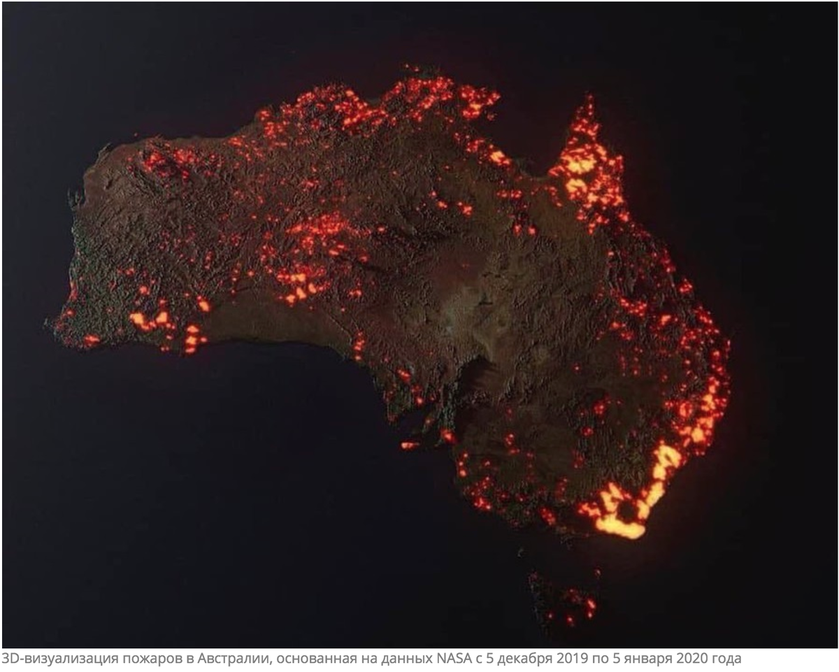 Как говорят местные австралийцы: "Пожары в Австралии дело обычное". В засушливый сезон то и дело появлялись очаги, которые местные службы или дождь вовремя устраняли. Но эти пожары 2019/2020 не похожи ни на что прежде. Возгорание началось в конце лета 19 года, попытки взять ситуацию под контроль ни к чему не привели и уже 11 ноября власти объявили о чрезвычайном положении. Сейчас январь 2020 года, но ситуация не улучшилась. Более того это только начало лета, которое обычно очень засушливое в Австралии, а значит ситуация может усугубиться. Какие последствия окажет этот пожар на Австралию сложно сказать, но уже площадь пожара составила 6 млн. гектаров (что в два раза превышает площадь пожаров в Сибири), погибло более 20-ти человек, еще больше пропало без вести, уничтожены сотни миллионов животных. Специалисты говорят, что популяцию коал уже не получится восстановить.