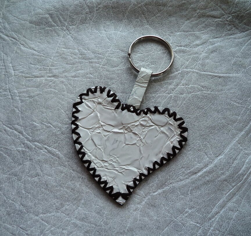 Например, очень прост в изготовлении брелок в виде сердца. Вырезаете из кожи два сердечка зеркально. Отрезаете неширокую полосочку кожи для петельки, продеваете её в колечко для ключей, складываете пополам, концы фиксируете клеем. Склеиваете сердечки между собой, лицевыми сторонами наружу. Между сердечками вклеиваете кожаную петельку. А сердечко обшиваете через край обметочным швом. Нитки можно использовать любые. У меня вощеные нити.