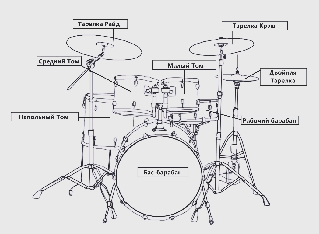 Стандартная ударная установка состоит из следующих элементов: Тарелки Хай-хэт (англ.hi-hat) — состоит из двух тарелок (верхняя top и нижняя bottom) , установленных на одной стойке и управляемых педалью. Барабаны Комплектация ударной установки может отличаться количеством тарелок, томов,а также могут использоваться два бас-барабана или кардан (педаль с двумя колотушками) в зависимости от того,в каком жанре играет музыкант.
