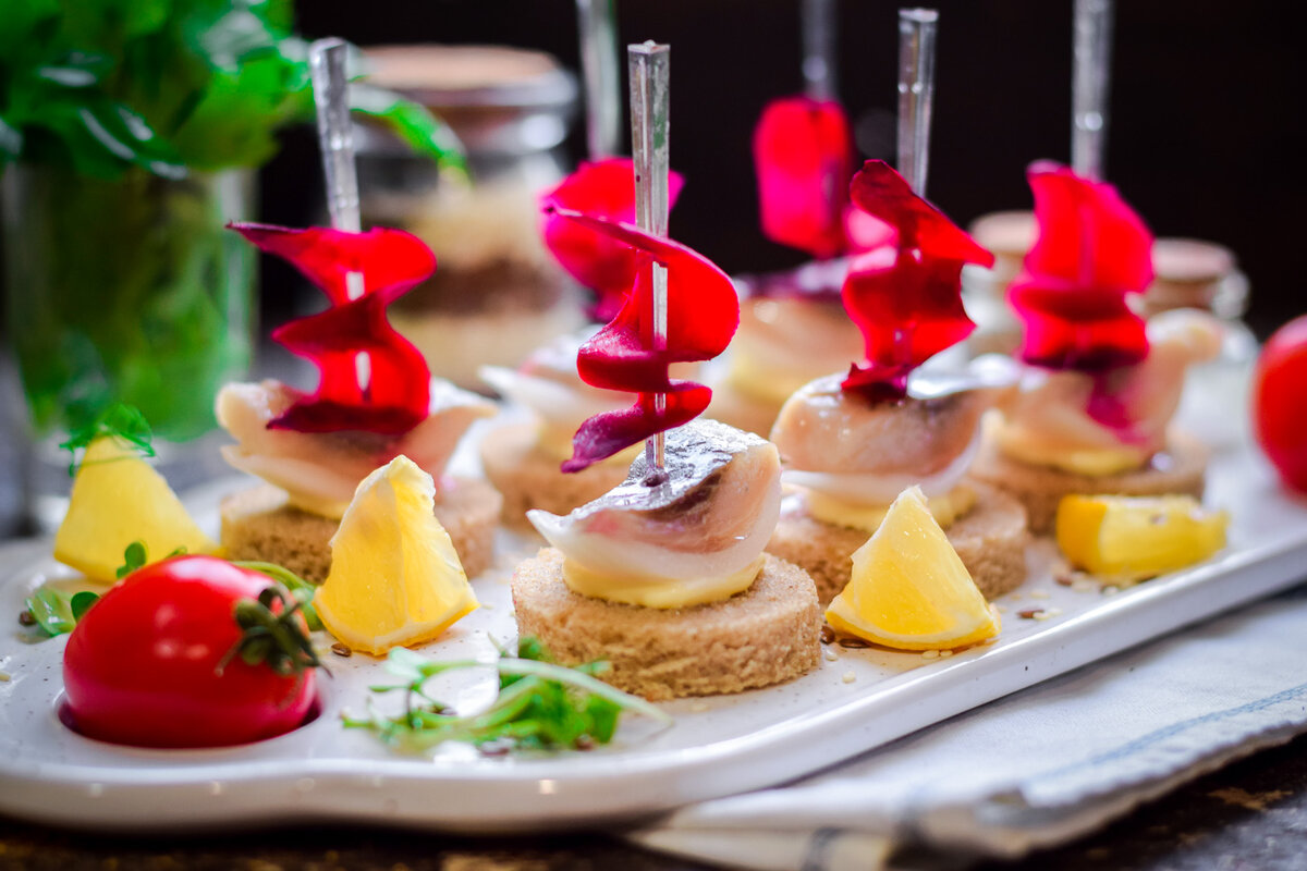 Приготовила на очередное застолье канапе и хочу теперь поделиться с вами рецептом. Муж сказал, что лучшей закуски под водочку он еще не пробовал! Теперь буду готовить такое каждый раз на праздники. Подготовить все по списку, селедка должна быть вкусной, слабосоленой. При помощи любой формочки вырезать из хлеба порционные кружочки или квадратики – как вам больше нравится. Вареную свеклу нарезать пластинками, репчатую луковицу взять небольшого размера, очистить и разрезать пополам, разобрать на лепестки. Также подготовить шпажки. Каждый кусочек хлеба смазать немного майонезом. Поверх уложить по дольке лука. Кстати, по желанию, лук предварительно можно промариновать. На каждую шпажку нанизать сначала свеклу, после кусочек сельди – как показано на фото. Воткнуть шпажки в заготовки хлеба и подавать закуску можно к столу, украсив зеленью. Ингредиенты: Серый хлеб – 2-3 ломтика Сельдь – 150 г Лук – 0,5 шт. Свекла вареная – 1 шт. Майонез – 1 ст.л. Укроп – для украшения Соль, перец – по вкус