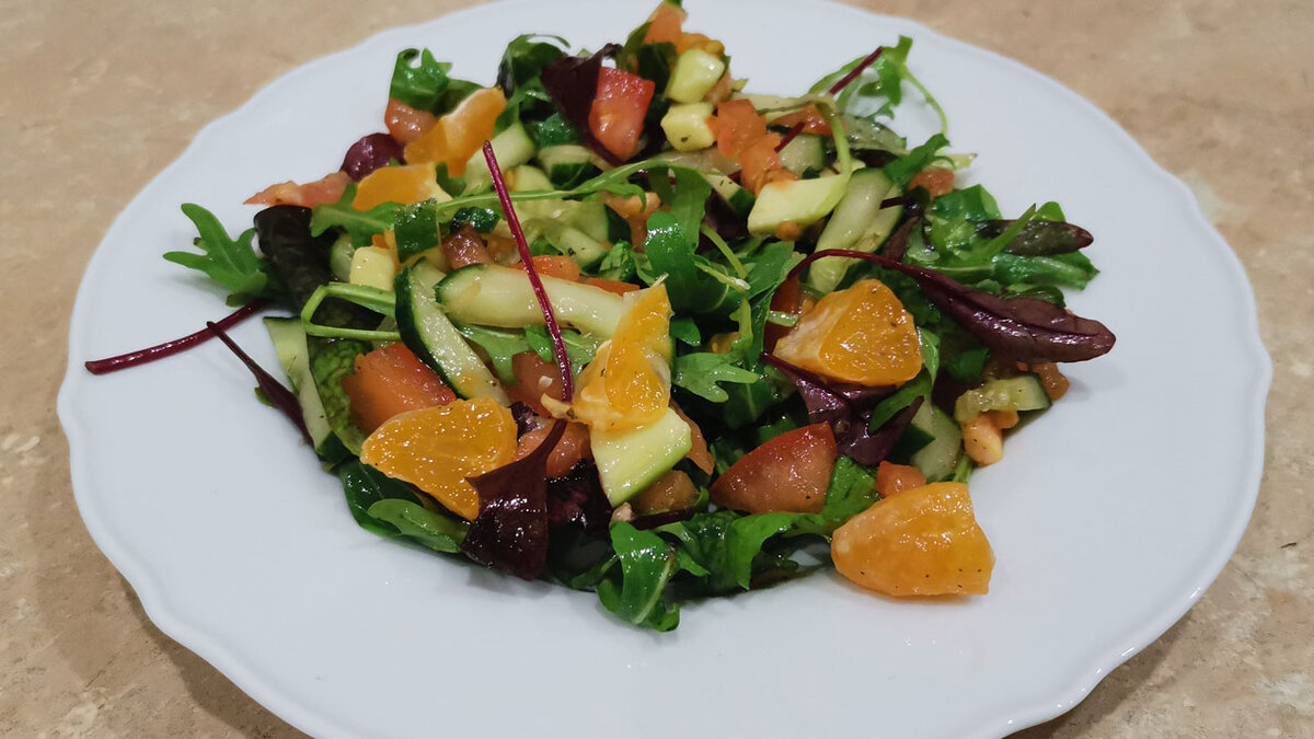 Сегодня у нас новый и вкусный салатик с мандаринками. На 4 порции Вам потребуется: Смесь листьев салата - 100 гр. Огурцы - 1шт. Помидоры - 2 шт. Авокадо - 0,5 шт. Мандарин - 2 шт. Для соуса: Соевый соус -1 ст. лож. Оливковое масло – 2 ст. лож. Чеснок – 1 зубчик Соль, перец, базилик по вкусу. Видео-рецепт Делитесь своим мнением в комментариях! Спасибо за лайк! Подписывайтесь, тут интересно)