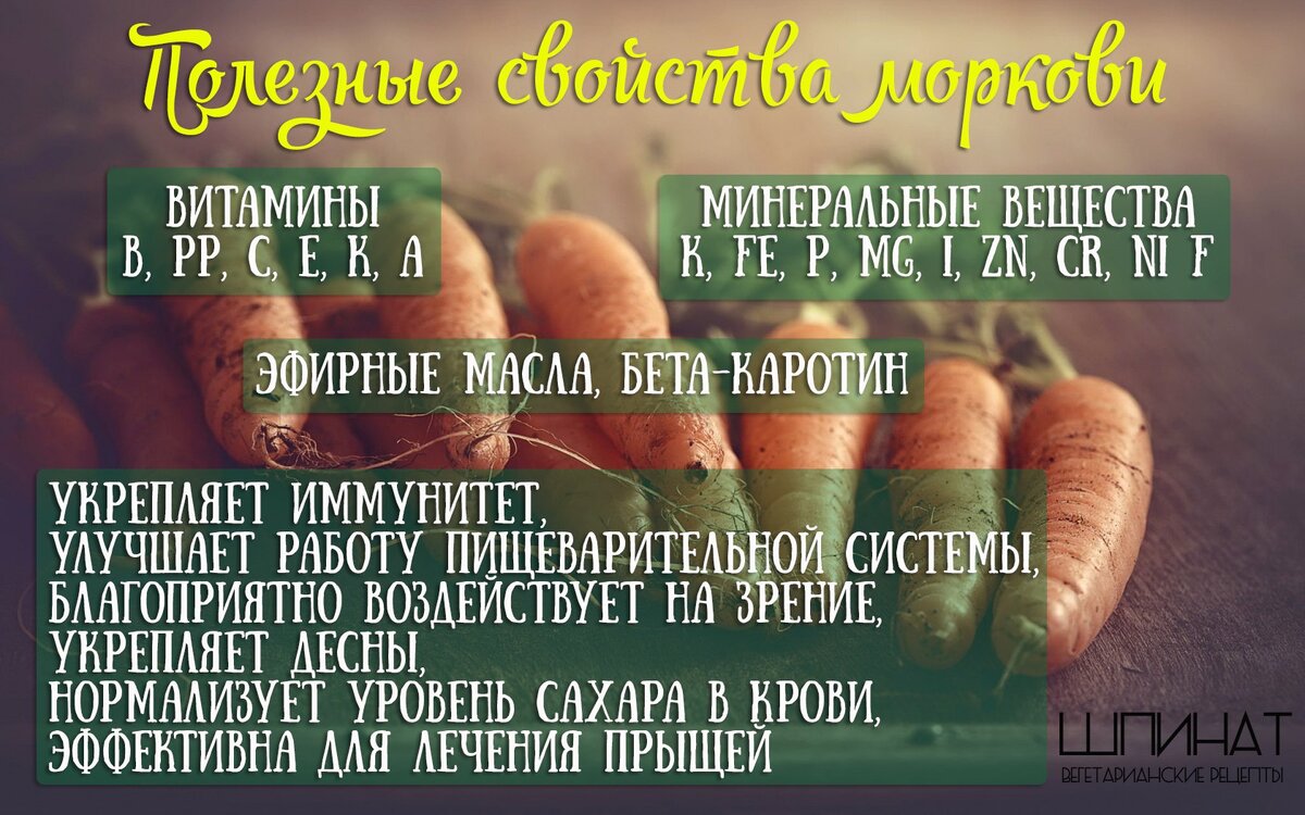 ➕ Морковь – хороший источник витамина A. Суточная доза которого содержится в двух корнеплодах моркови. Бета-коротин благоприятно влияет почти на весь организм и несет в себе массу полезных качеств. Чтобы он хорошо усвоился нужно принимать морковь совместно с растительным маслом. ➕ Польза моркови для глаз. Наши глазки очень любят витамин A. Его нехватка может спровоцировать куриную слепоту и другие заболевания глаз. Чтобы навсегда забыть проблемы с органами зрения – регулярно употребляйте морковь в своём рационе. ➕ Морковь полезна больным сахарным диабетом. Врачи-диетологи рекомендуют употреблять вареную морковь диабетикам. В вареной моркови на 34% больше антиоксидантов, чем в сырой. ➕ Польза моркови для сердечнососудистой системы. Сырая морковь хорошо понижает уровень холестерина в крови. Что является хорошей профилактикой сосудов и сердца. Регулярное употребление моркови в пищу снижает риск возникновения инсульта на 70%. Так как хорошо стимулирует кровообращение головного моз