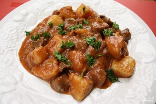 Убавить огонь и тушить минут 30. Не забывайте периодически перемешивать подлив. Положить в сковороду лавровый лист. 5 штук перца горошком, соль, и порезанную зелень. Включить огонь, а сковороду оставить, чтобы подлив настоялся. На гарнир можно подать отварной рис, макароны и картофельное пюре.