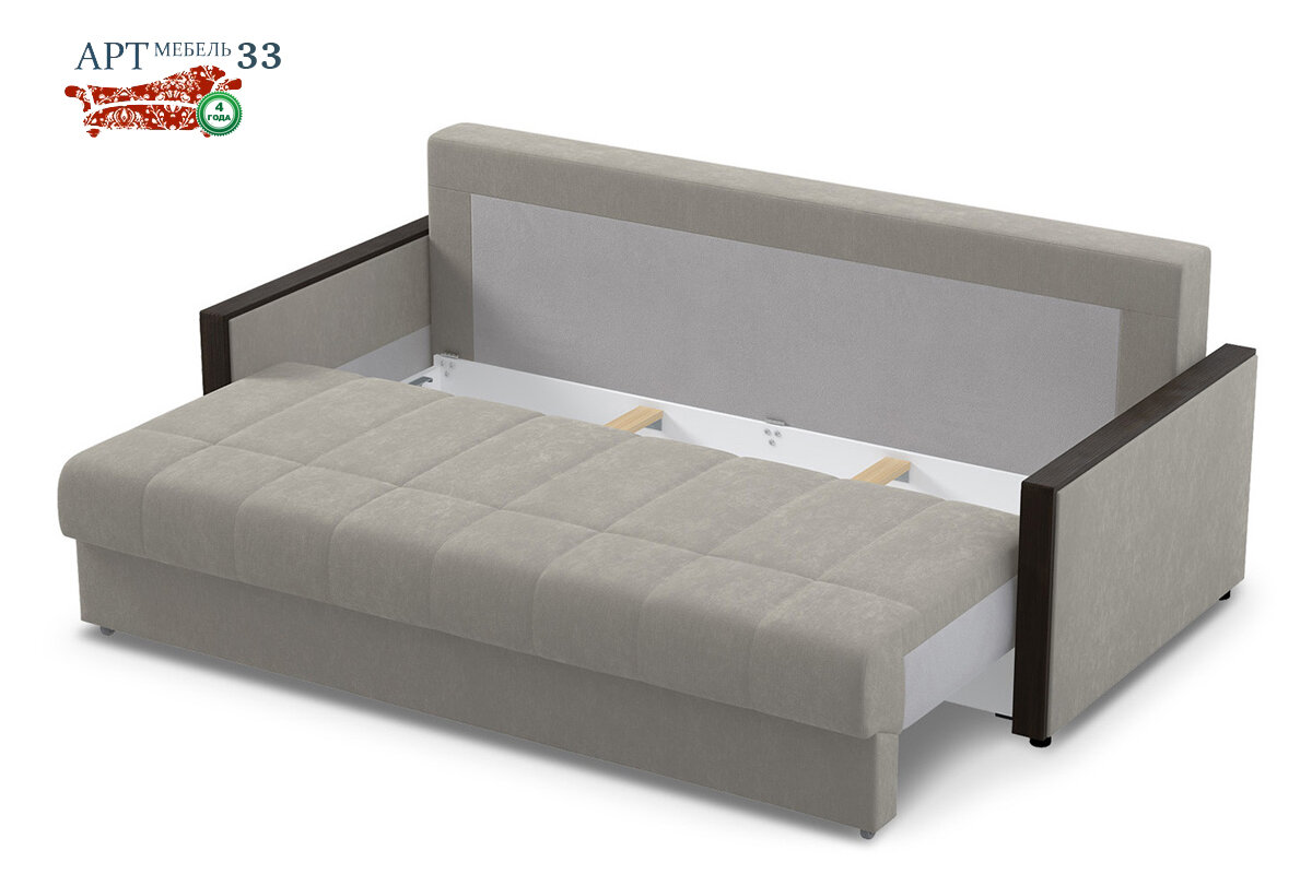 Один из самых популярных механизмов наряду с Аккордеоном. Принцип действия механизма трансформации еврокнижка прост и в то же время гениален. Диван состоит из двух крепких конструкций с мягкими частями – сидение и спинка. Если нужно разложить механизм, то простое выкатывание или вытягивание сидения, делает из небольшого компактного дивана полноценное капитальное спальное место. На пустое место устанавливается-опускается спинка. Конструкция отличается надежностью и конструктивной простотой - имеются направляющие из твердых пород дерева или экологичной фанеры, по которым передвигаются ролики для раскладывания механизма, установленные сзади внизу сиденья. Фронтальная часть так же опирается колесиками об пол. Данный механизм всегда имеет пространство для ящиков под собой. Плюсы: Минусы: Большой выбор недорогих диванов еврокнижка в нашем каталоге