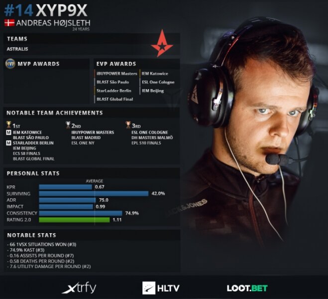 Andreas "Xyp9x" Højsleth занимает 14-е место в рейтинге 20 лучших игроков 2019 года.