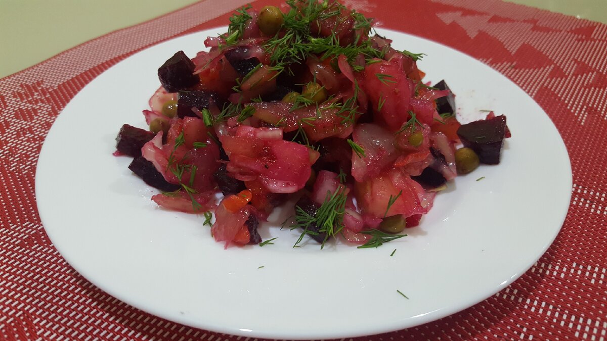 Винегрет - традиционное русское блюдо, которое привычно нам, жителям России, так как при приготовлении используются овощи, выращенные на наших огородах, ели огорода нет то, все ингредиенты можно в любое время года купить в супермаркете. Сейчас после череды праздничных дней он идеально подойдет тем, кто уже "Всего наелся" и хочет простой пищи. Самое сложное в приготовлении винегрета - это сварить овощи! Но можно это сделать проще, если у вас есть микроволновка. Как это делаю я можно посмотреть по ссылке, внизу в конце рецепта. Для винегрета потребуется: 1 большая свекла, 2 средних морковки, 3 картофелины, 1 луковица, 2 средних соленых огурца, небольшая чашечка капусты и 3 столовых ложки консервированного горошка. Для заправки: 4 столовых ложки оливкового (подсолнечного) масла, 1 столовая ложка бальзамического уксуса, 1 чайная ложка соли, 1 чайная ложка сахара и 1 чайная ложка смеси перцев. Свеклу, морковь, картофель необходимо сварить, почистить и нарезать средними кубиками. Квашен