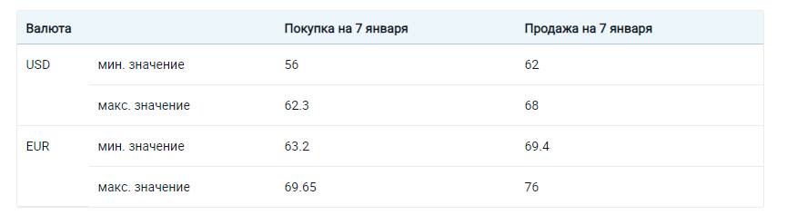Наименьшее зафиксированное значение в банках для евро – 69.4 (продажа), 63.2 (покупка). Самые высокий показатель – 76 (продажа), 69.65 (покупка). Курсы валют в банках РФ на 7 января На 7 января банки России предлагают следующие курсы покупки-продажи доллара и евро: Кросс-курс для пары USD-EUR составляет 0.8923 евро. Детальную информацию по значениям кросс-курсов на 7 января 2020 можно найти на странице конвертера. Оставляйте свое мнение в комментариях на канале Ru.myfin.by.