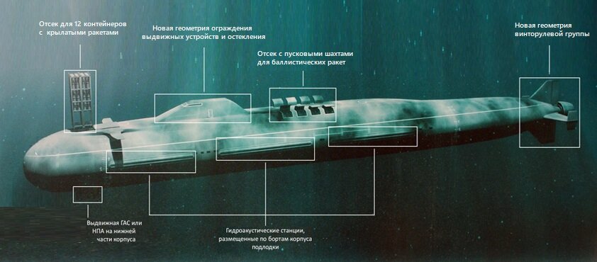 Разработка многоцелевой субмарины следующего поколения «Хаски» началась в России в 2014 году. Работы по её созданию ведутся в Санкт-Петербургском КБ «Малахит». Там же параллельно создаётся первая отечественная подлодка, не зависящая от воздуха из атмосферы. «Хаски» должна обладать водоизмещением около 13 тысяч тонн. Она будет оборудоваться зенитными и противокорабельными ракетами. Среди них будет находиться «Циркон» с дальностью пуска 500 километров и «Калибр-ПЛ», размещаемый в торпедных аппаратах калибра 533 мм. Кроме этого, планируется установка ядерных торпед «Посейдон» с неограниченной дальностью действия. В общей сложности на борту сможет одновременно находиться до 80 ракет. Лодка будет оснащена атомным реактором, где в роли теплоносителя выступит жидкий металл. Благодаря модульной конструкции, элементы которой совместимы с другими субмаринами, производство должно быть относительно экономичным. Новая «Хаски» будет стоить дешевле легендарной субмарины прошлого четвёртого поколения