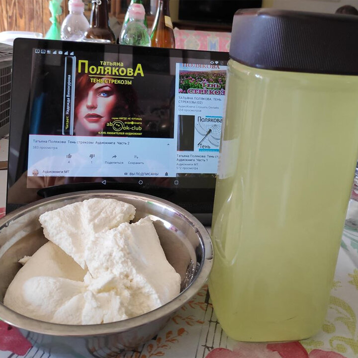 Продукты: ✔ кефир (или простокваша, или йогурт без добавок). Процесс: Я, как правило, готовлю творог из местной простокваши, которая продаётся в коробочках на 200 грамм. Использую восемь коробочек (это связано не с количеством самой простокваши, а с оплатой: если берёшь сразу четыре коробочки, они обходятся дешевле. Я беру два раза по четыре). Выкладываю всю простоквашу в толстостенную кастрюлю и ставлю её на минимальный огонь, причём, закрываю конфорку двумя рассекателями пламени. Следить за поведением простокваши нужно очень пристально: если слишком долго её греть, творог получится слишком сухой. Я прекращаю нагрев, когда вижу, что сыворотка отделилась полностью, изначальной простокваши в кастрюле нет, а есть сгустки творога. Застилаю дуршлаг двойной марлей, устанавливаю его над другой кастрюлей и выливаю в него нагретую простоквашу (уже почти творог). Дожидаюсь, когда сыворотка стечёт полностью, собираю углы марли, полностью закрываю ими содержимое марли, накрываю тарелкой и ставлю