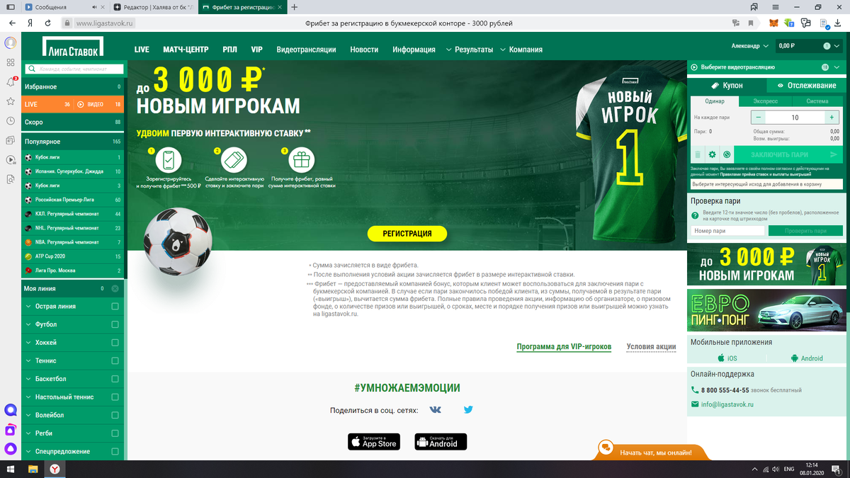 Переходим по ссылке https://www.ligastavok.ru/ и создаем аккаунт для удобства лучше скачать приложение далее проходим индетификацию можно пройти как на сайте так и в их конторе когда вы подтвердите свои данные вам начислят фрибеты от 500 до 3000 как это работает? А вот допустим вы ставить 1000 фрибетов на кэф 2.1 то получите 2100-1000 фрибетов=1100 рублей которые можете вывести действуйте)